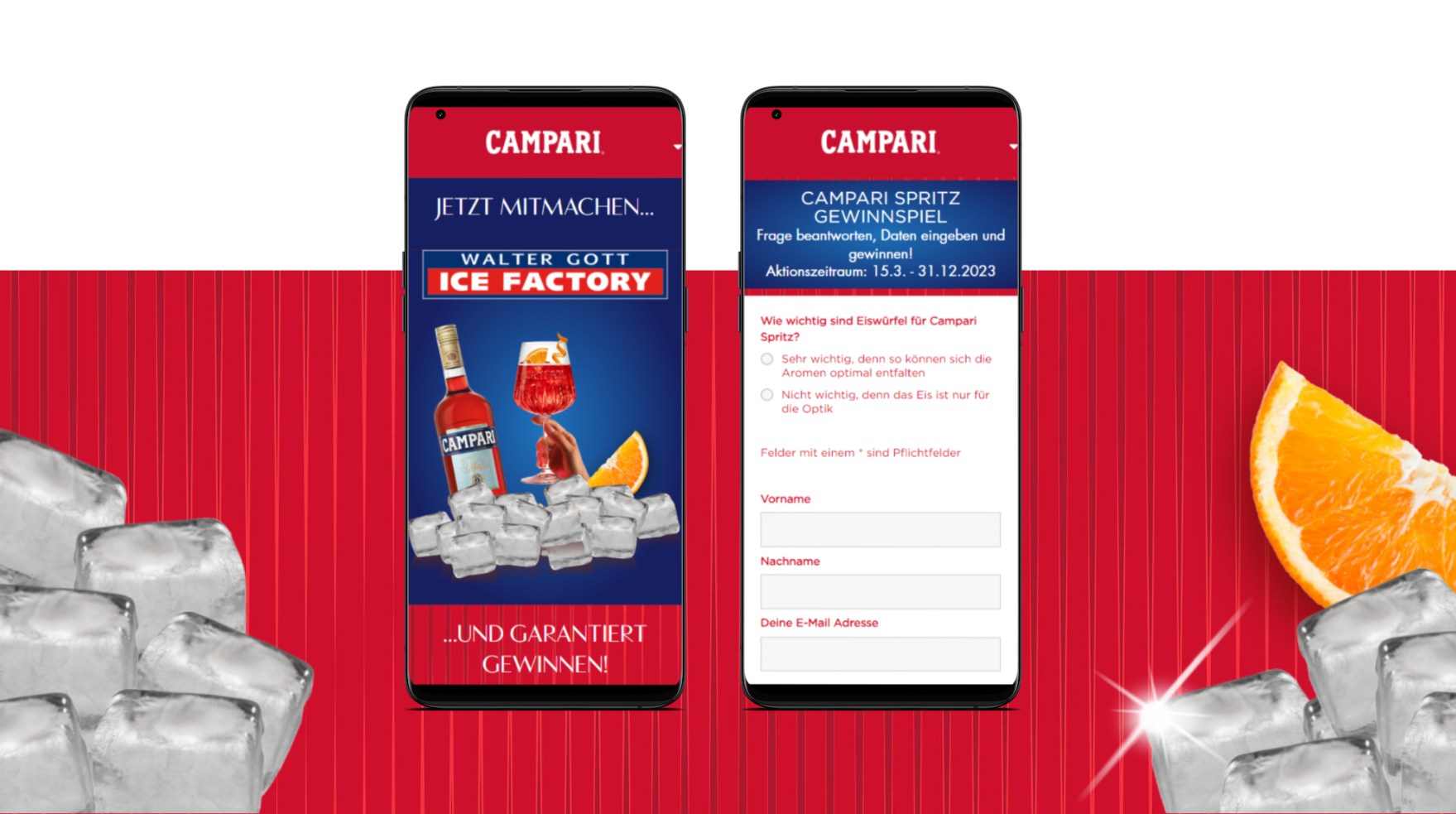 Kern der Aktion waren QR-Codes auf den Eiswürfelpackungen von Walter Gott, dem Kooperationspartner bei der Kampagne. Diese QR-Codes leiteten die Verbraucher auf die Aktionsseite weiter, die in die Markenwelt der Campari Group integriert war. Hier hatten die Teilnehmer die Möglichkeit, an einem Gewinnspiel teilzunehmen und Campari Spritz Probier-Sets zu gewinnen. Dazu mussten die User lediglich eine Frage beantworten und ihre Daten angeben, um die Teilnahme abzuschließen. Als Trostpreis erhielten alle garantiert einen digitalen Cocktailguide mit den verschiedensten Rezepten und Inspirationen.