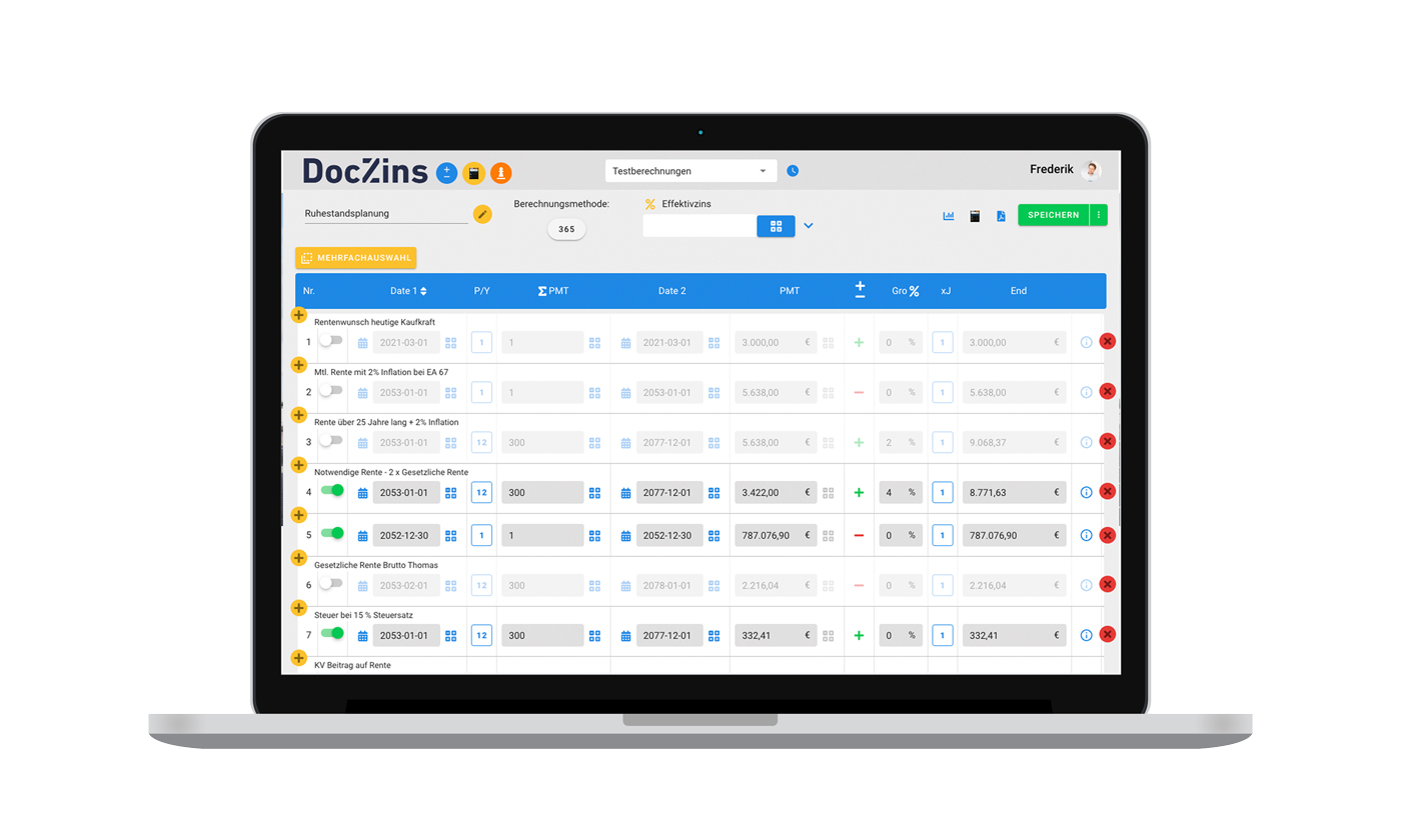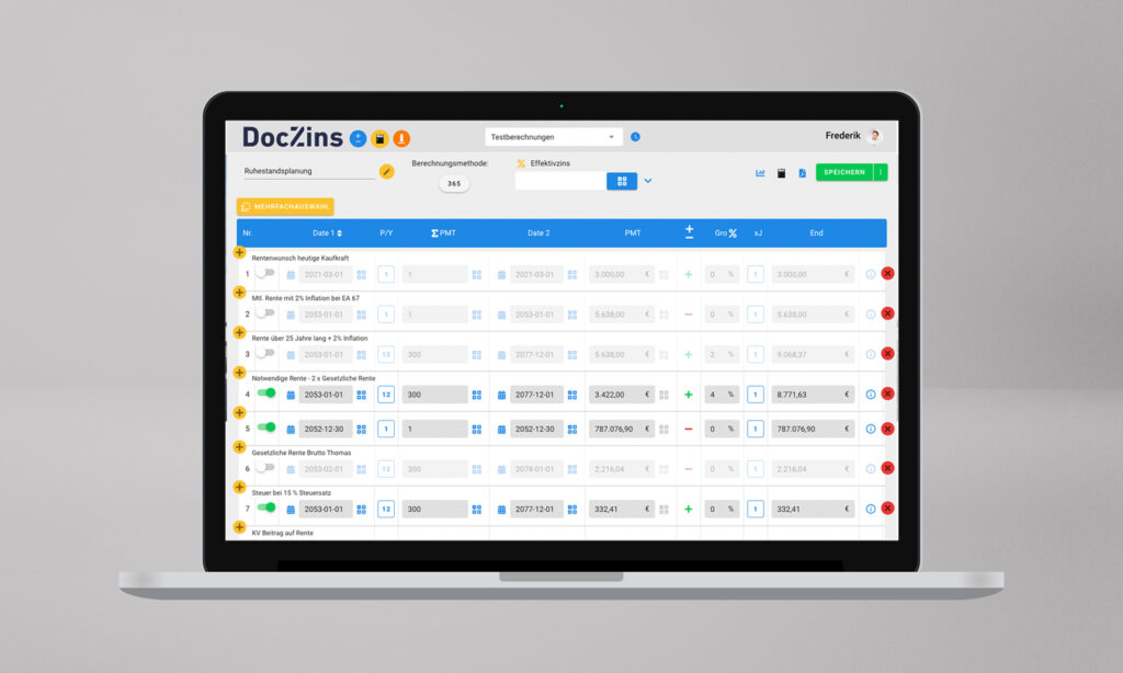 Gemeinsam mit Prof. Dr. Bernd W. Klöckner und seinem Team der DocZins GmbH & Co. KG haben wir  den innovativen Online-Finanzrechner DocZins StepCalc entwickelt. Mit Hilfe von DocZins StepCalc können Finanzberater in Form eines Treppenrechners Finanzprodukte auf den Punkt genau berechnen und beurteilen. Dadurch ist es möglich bspw. Altersvorsorge-Modelle in allen Szenarien zu kalkulieren und Kunden eine fundierte Empfehlung auszusprechen.