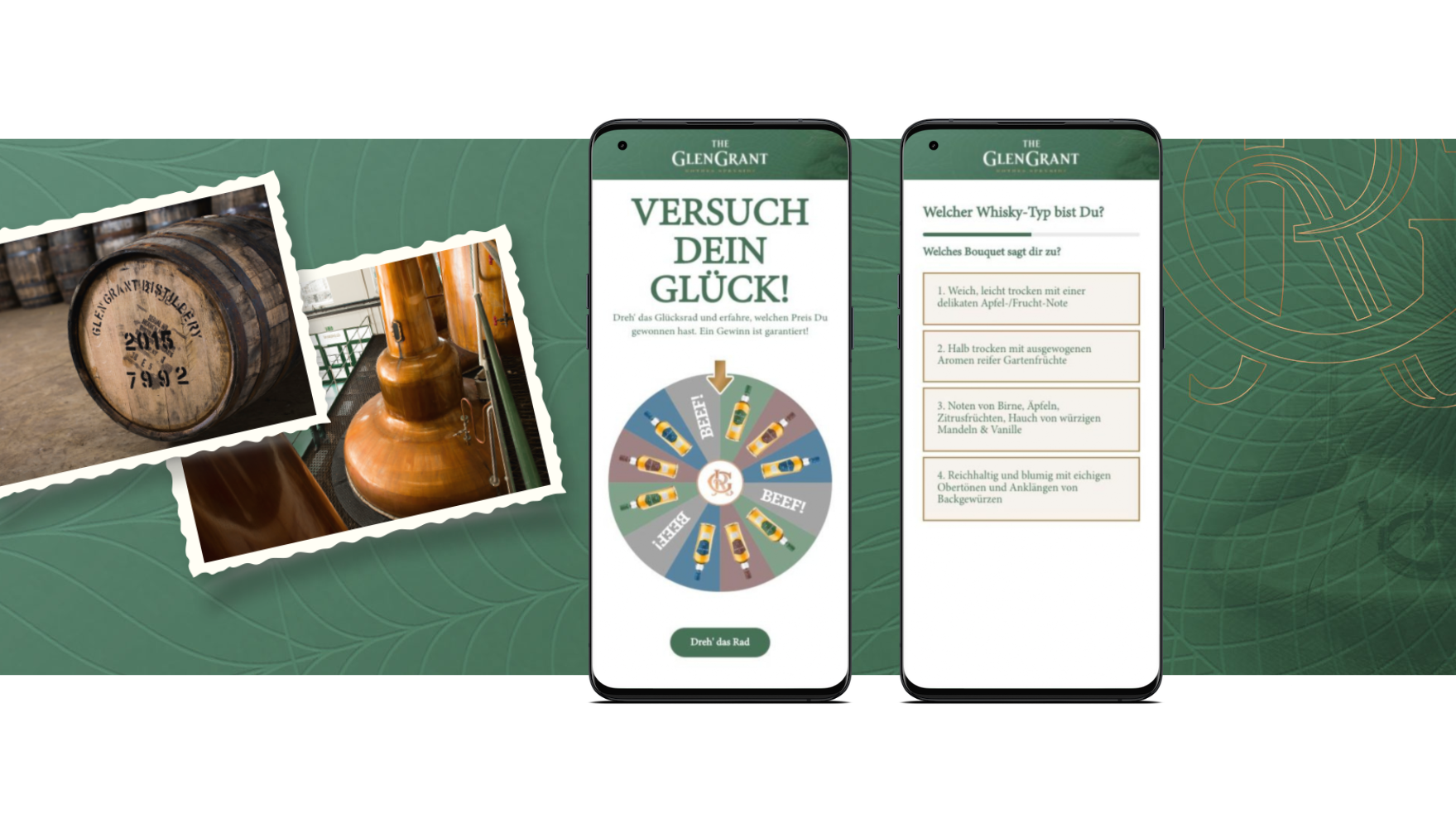 Unter dem Claim „Erfahre welcher Whisky-Typ du bist“  können die Nutzer auf der Mobile First Landingpage ein kurzes Quiz durchlaufen und bekommen im Anschluss die zu ihren Wünschen passende Sorte Glen Grant angezeigt.