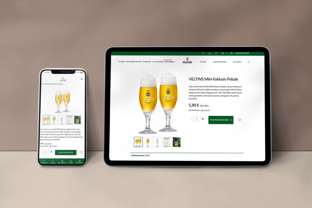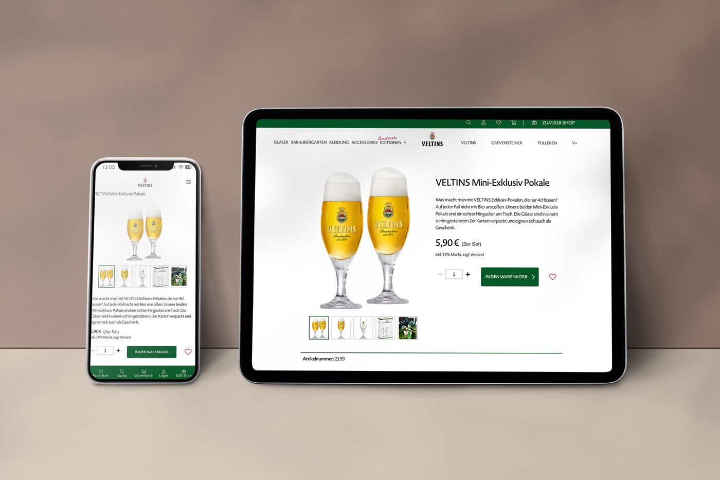 Mit der aktuellen Version von Shopware 6 erhält Veltins ein modernes Headless-Shopsystem mit innovativen Backend und einem von uns entwickelten UX-Optimierten Frontend auf Basis des CI von Veltins. Zeitgleich wird die Einbindung des Warenwirtschaftssystem in Shopware 6 durch uns umgesetzt. Mit Shopware 6 haben wir den technologisch eingeschlagenen Weg der API-First Headless Entwicklung konsequent weiter geführt. Mit API-first wird eine technische Basis geschaffen, mit der Kunden unterschiedliche digitale Touchpoints über Schnittstellen (API) in ihre Customer Journey einbinden können. Über unterschiedliche Profile kann so ein Online-Shop je nach Verkaufskanal (B2B oder B2C) über ein System unterschiedliche Shop-Designs ausspielen